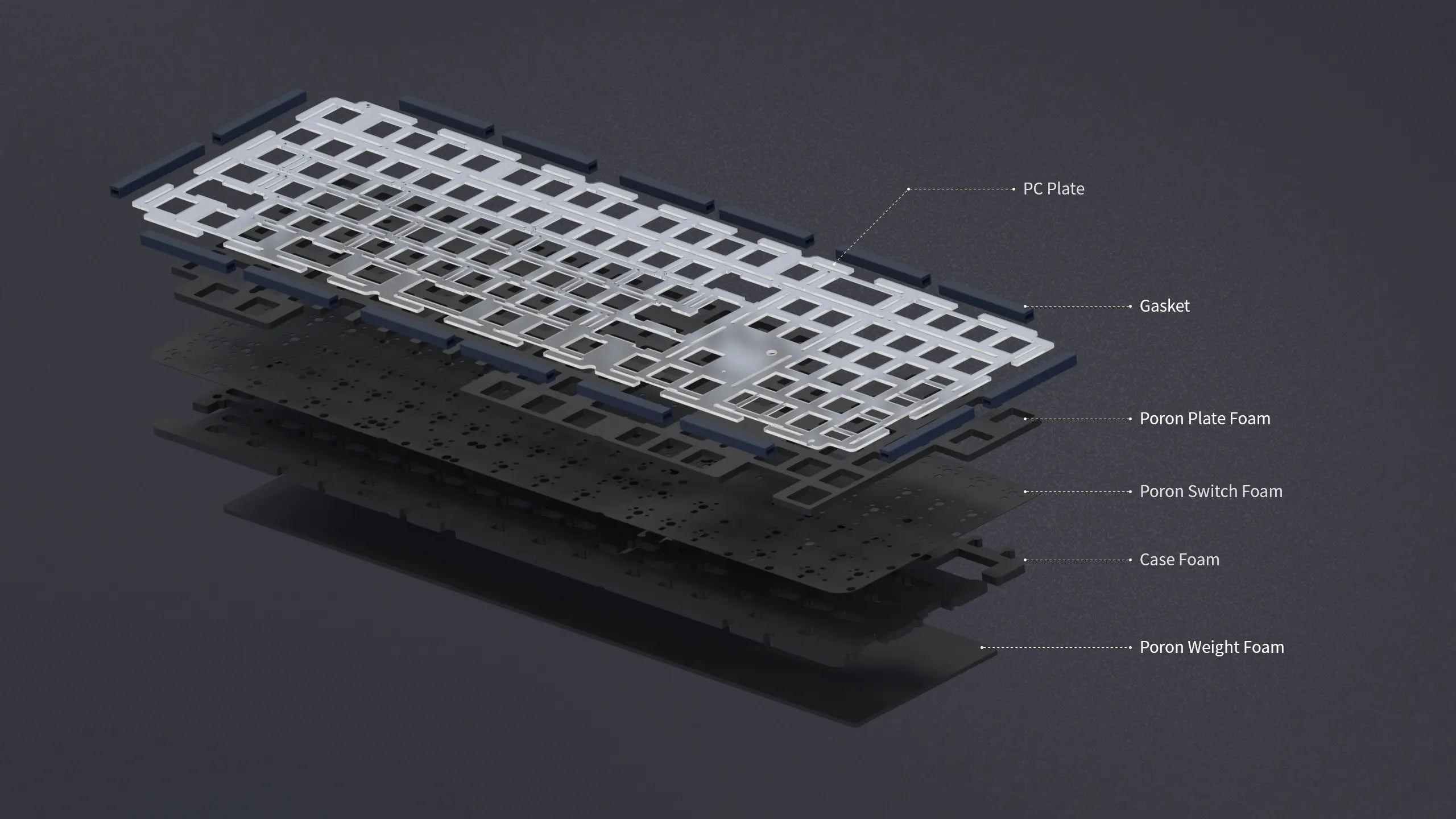 PCB and Bottom Case are made of lighter PORON material. To reduce resonance, many tests were done on the foaming material this time. We made the PORON lighter and the foam pores dense. Every minor detail matters a lot, with the current poron, the sound is more concentrated and is deeper than with normal dampeners.
