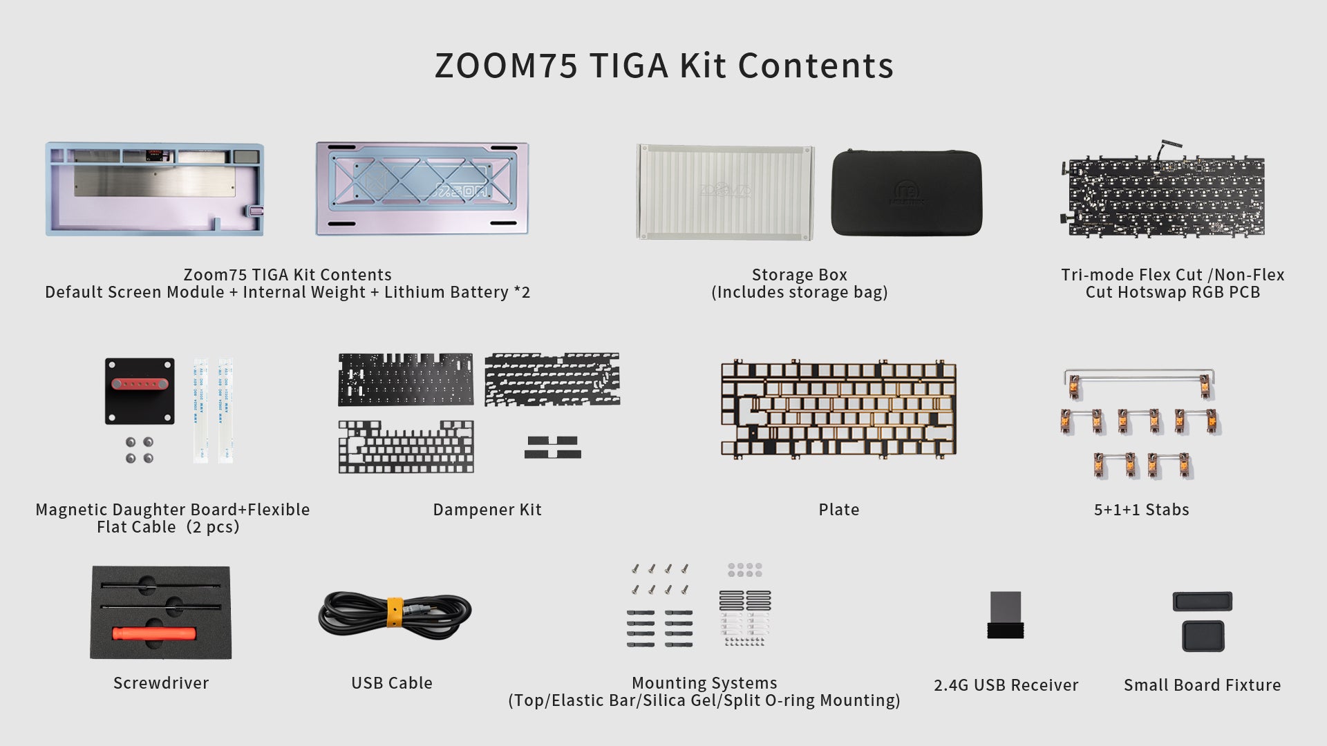 This zoom 75 tiga was my first custom build ever and honestly it went really well. The build process is very easy thanks to ball catch system and the keyboard overall is very good. However I've had a slight problem, I first built my keyboard with the silica gel mount which was fine. But today I wanted to try the elastic bar mount and realized that I was missing one. I had never opened the pack with them inside so I'm a little saddened that I can't use this mount. I would be very thankful if it was possible to send me even a single elastic bar so that I can use the mount. But overall this keyboard has been amazing.